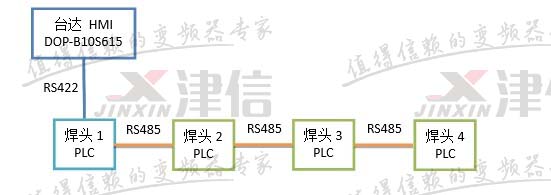 HMI和焊頭1的PLC之間采用三菱支持的RS422通訊,通訊速率可達115200bps。焊頭1的PLC和其它三個焊頭的PLC之間采用三菱PLC支持的N:N網(wǎng)絡,通訊速率最高為19200bps。